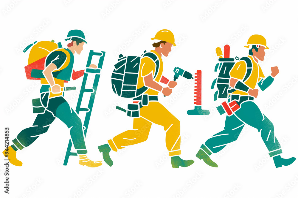 labor worker illustration, builders with tools running, plasterboard ...