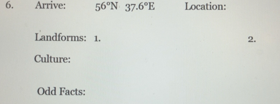 Solved: Arrive: 56°N 37.6°E Location: Landforms: 1. 2. Culture: Odd ...