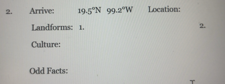 Solved: Arrive: 19.5°N99.2°W Location: Landforms: 1. 2. Culture: Odd ...