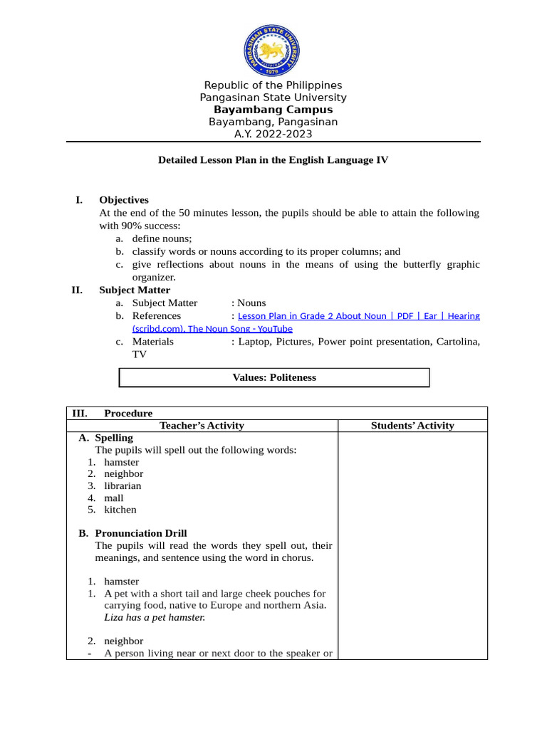 A Detailed Lesson Plan in English 4 | Lesson Plan | Noun