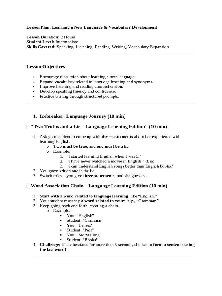 Lesson Plan- Learning a New Language & Vocabulary Development | PDF ...
