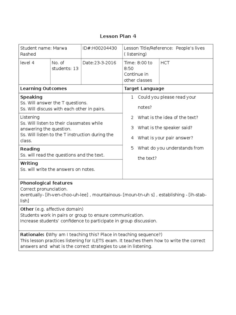 Lesson Plan 4: Learning Outcomes Target Language Speaking | PDF ...