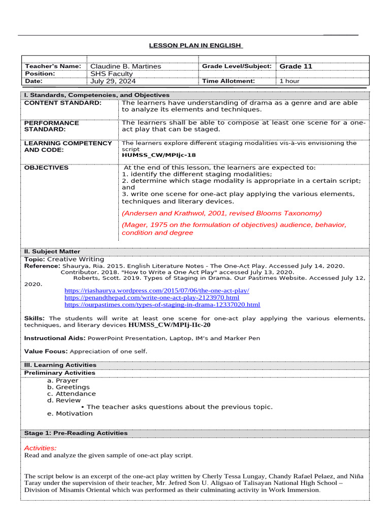 Lesson PLAN IN English 7-Oral Language - LESSON PLAN IN ENGLISH 7 Name ...