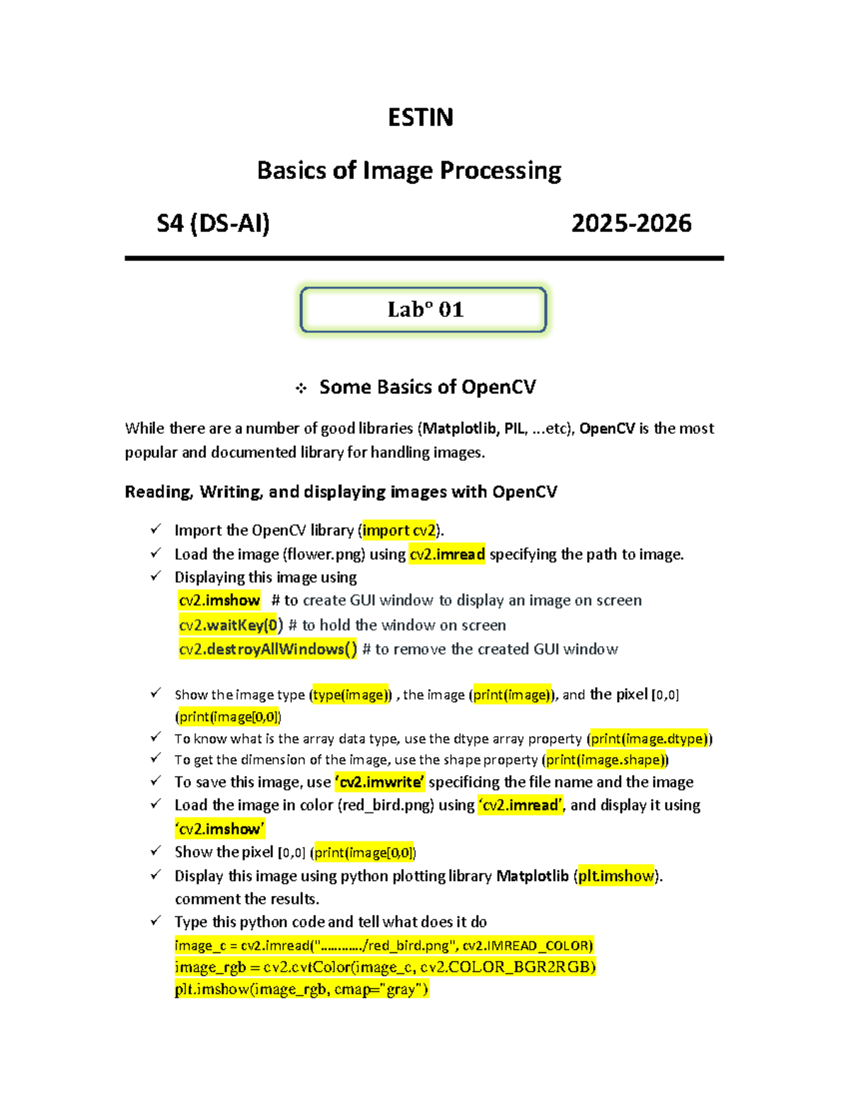 ESTIN S4 01 Basics of Image Processing with OpenCV - Studocu