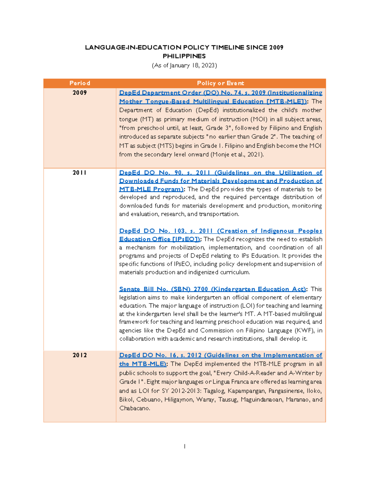 Timeline of Language-in-Education Policies in the Philippines (2009 ...