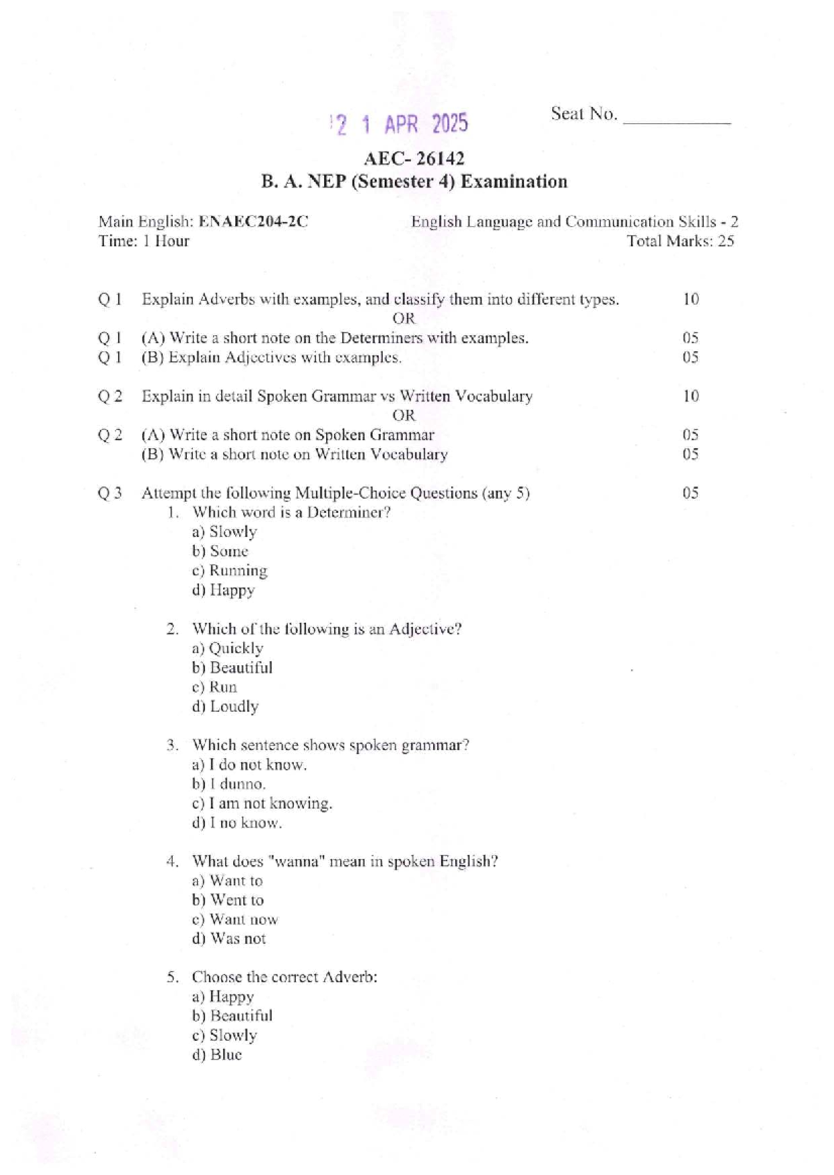 BA 26142 SEM-4 April 2025 Exam: English Language & Communication Skills ...