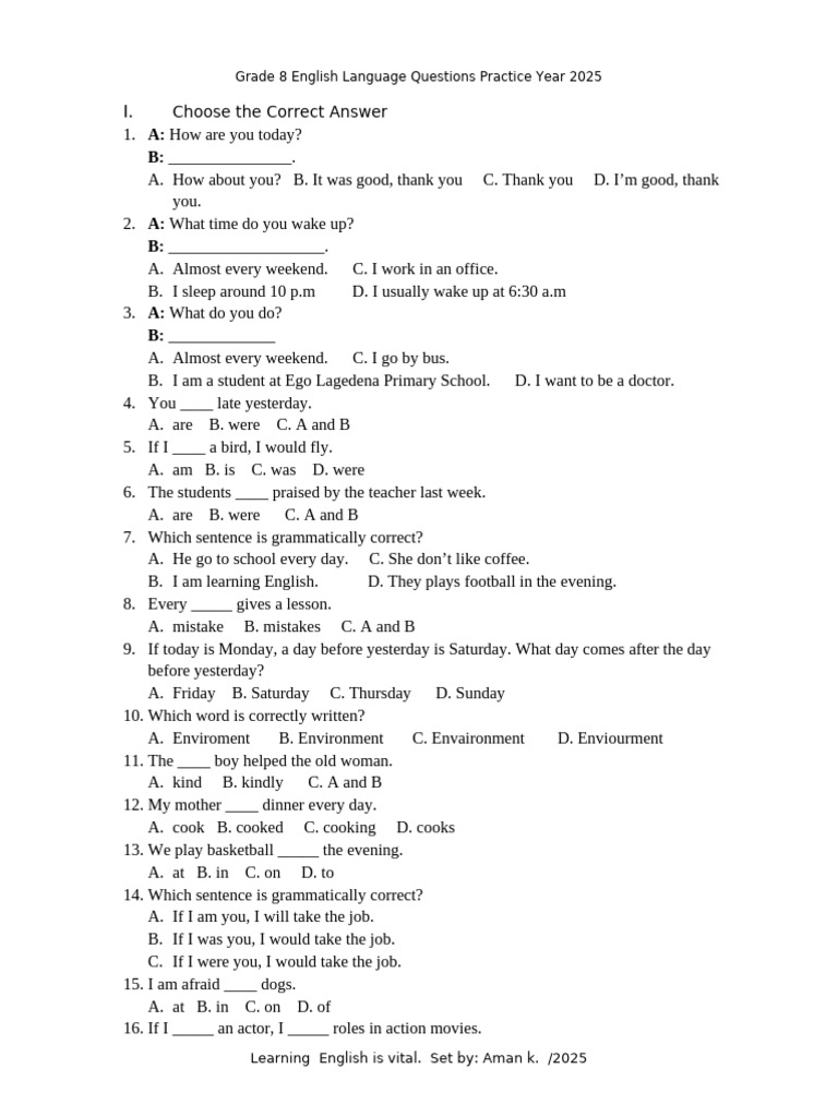 Grade 8 English Language Questions Practice Year 2025 | PDF