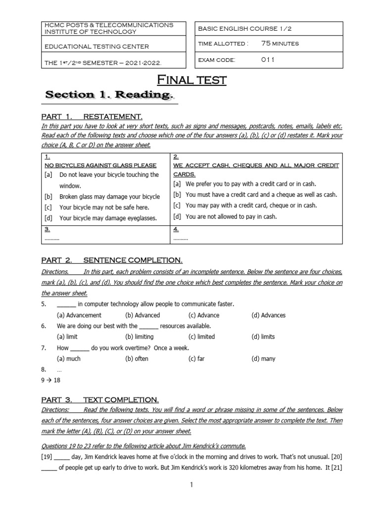 Sample-Test-Course 1&2 | PDF | English Language | Human Communication