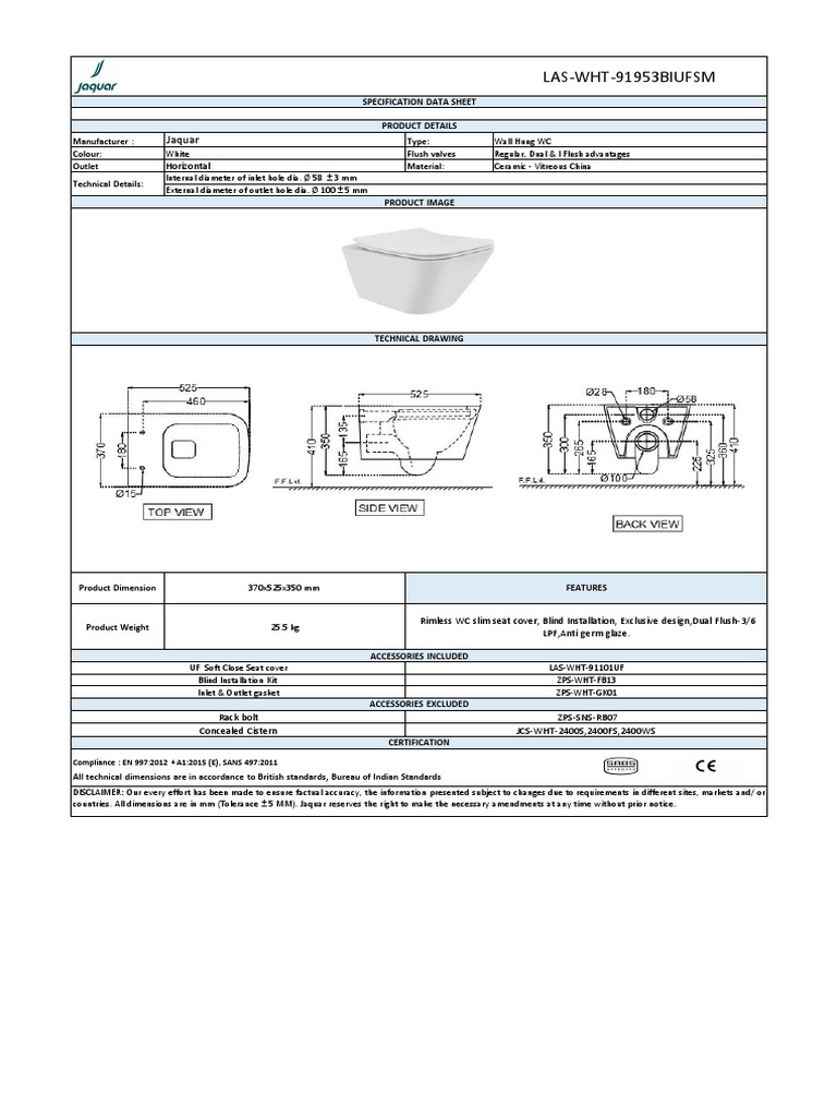 X Jaquar Laguna Rimless Back To Wall WC including Soft Close Seat LAS ...
