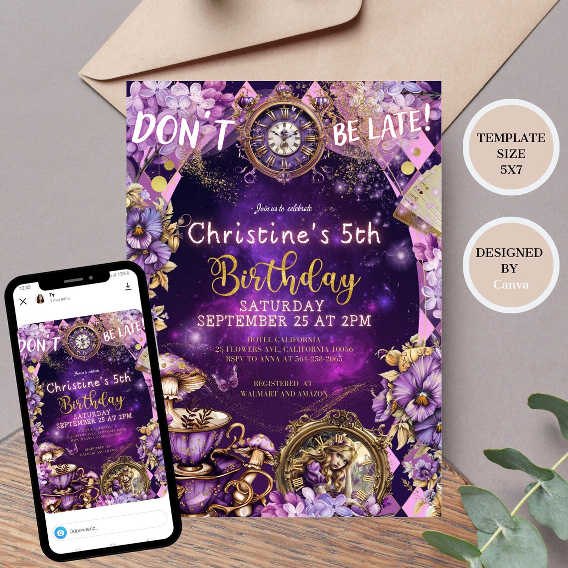 Don't Be Late Invitation, Alice in Wonderland Purple Gold Invitation ...
