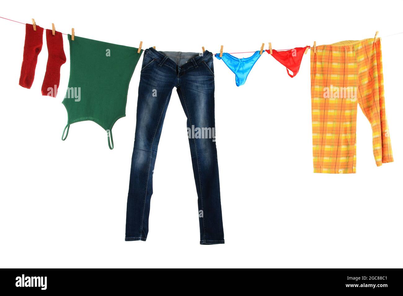 Laundry line with clothes on a white backround Stock Photo - Alamy