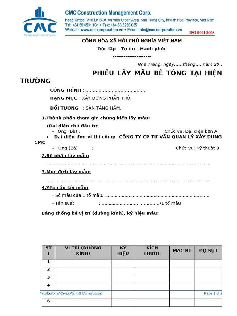 Phieu Lay Mau Betong Tai Hien Truong San Tang Ham | PDF