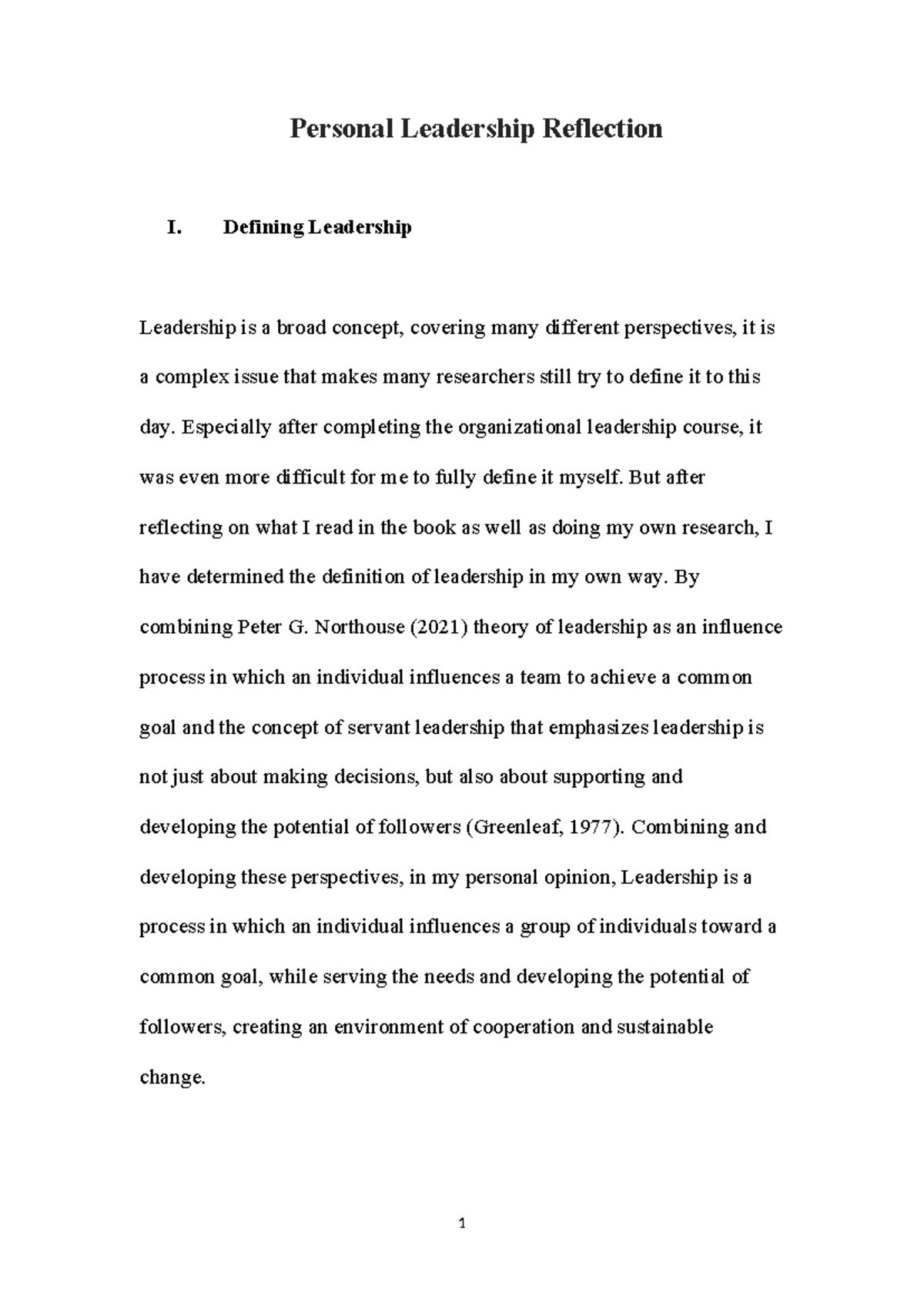 Reflection LEO 2024 - Personal Leadership Reflection I. Defining ...