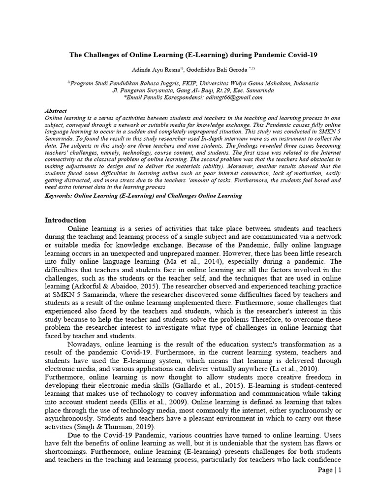 Article “ The Challenges of Online Learning (E-Learning) during ...