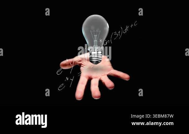 Animation of light bulb over woman's hand and mathematical data ...