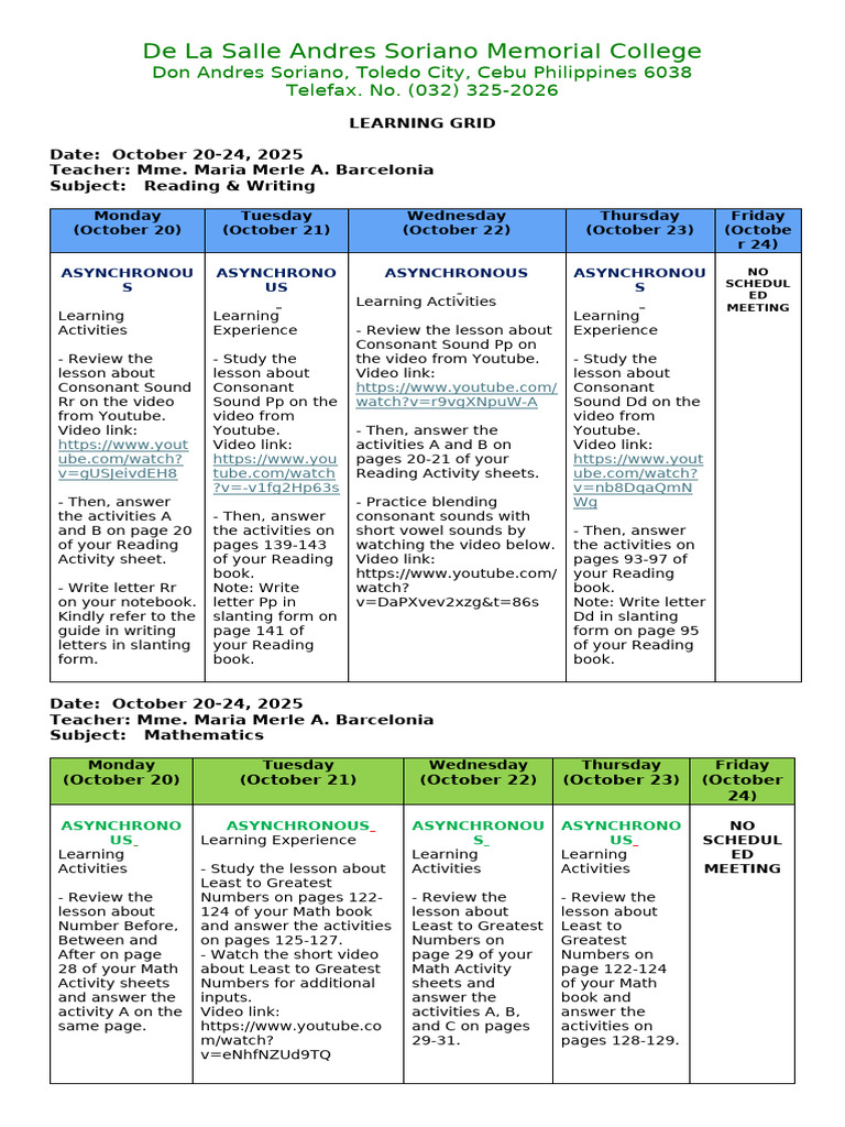 LEARNING GRIDS FOR KINDERGARTEN - Oct. 20-24, 2025 | PDF