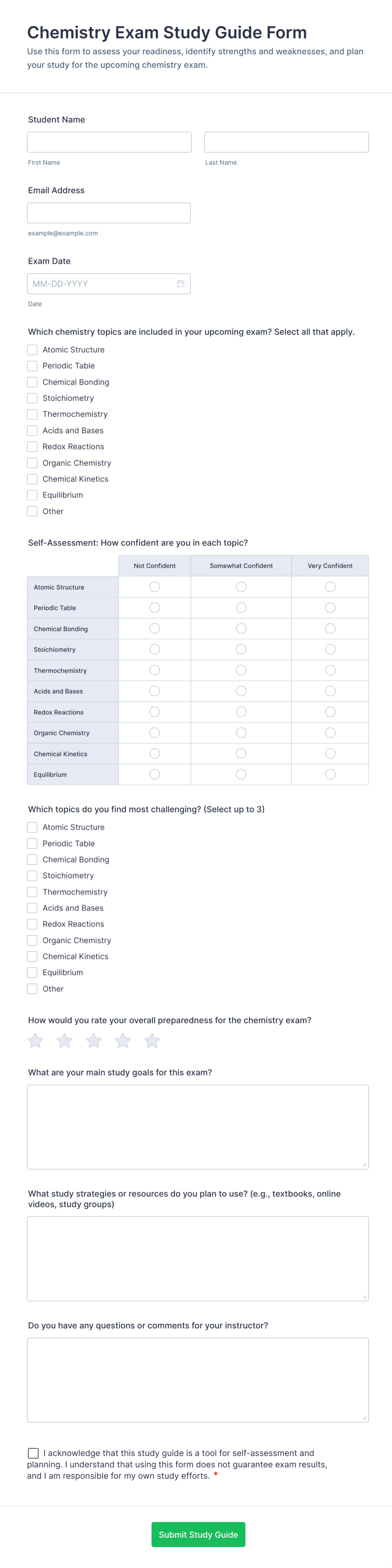 Chemistry Exam Study Guide Form Template | Jotform