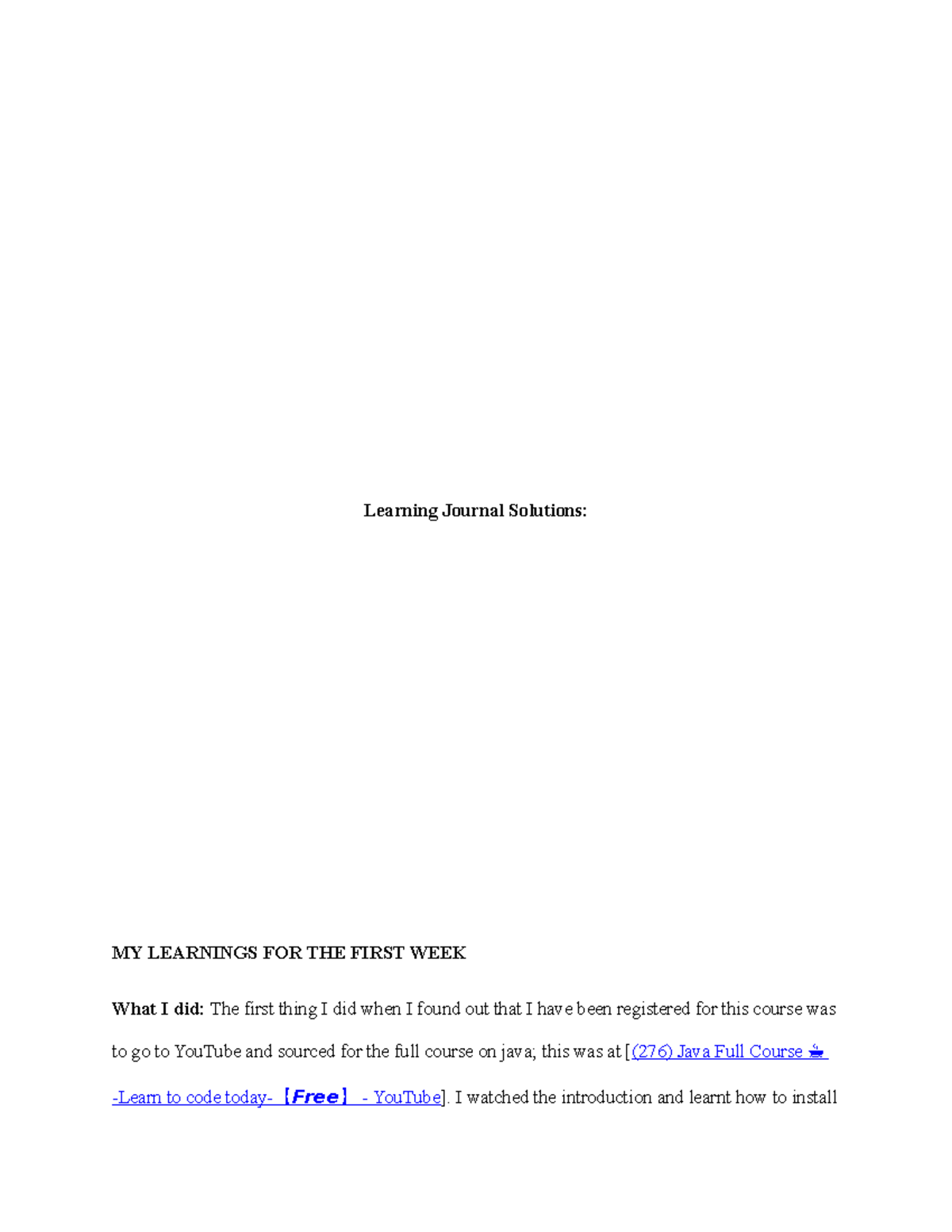 LJ WEEK ONE - LEARNING JOURNAL - Learning Journal For this Learning ...
