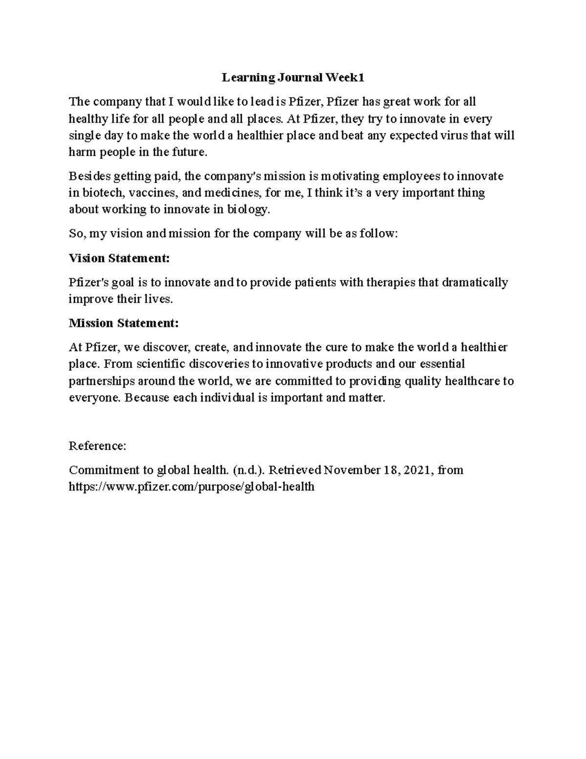 Learning Journal Week 1 - Learning Journal Week The company that I ...