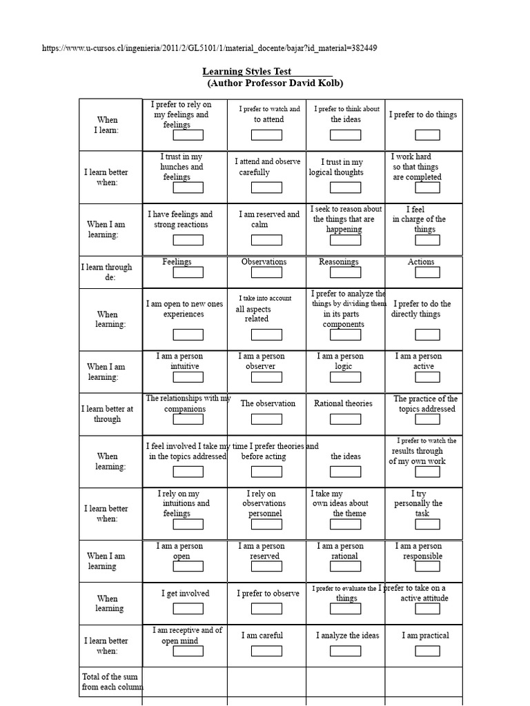 Learning Styles Test by David Kolb | PDF | Learning Styles | Concept
