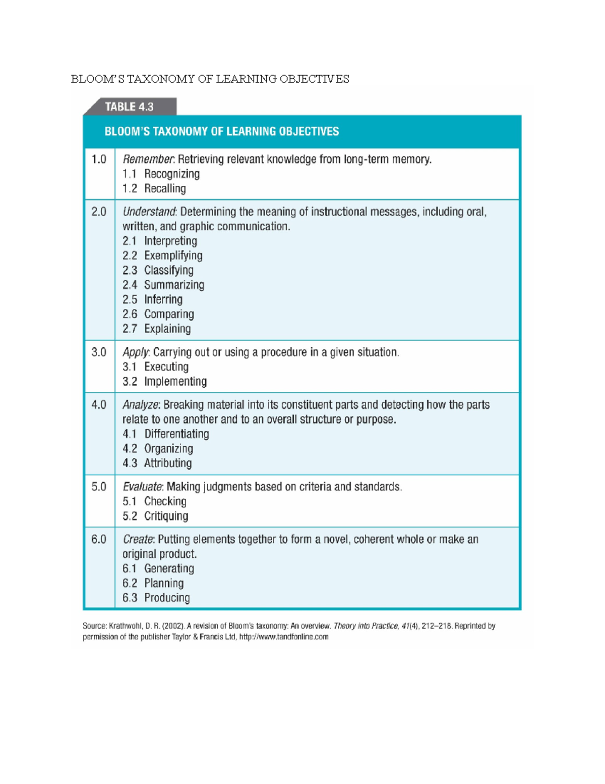 Bloom’S Taxonomy OF Learning Objectives - MANA444 - BLOOM’S TAXONOMY OF ...
