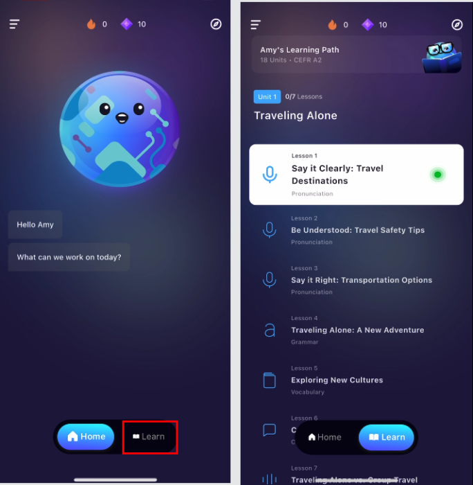 Gamified Learning path with six levels, concepts covered and milestone ...