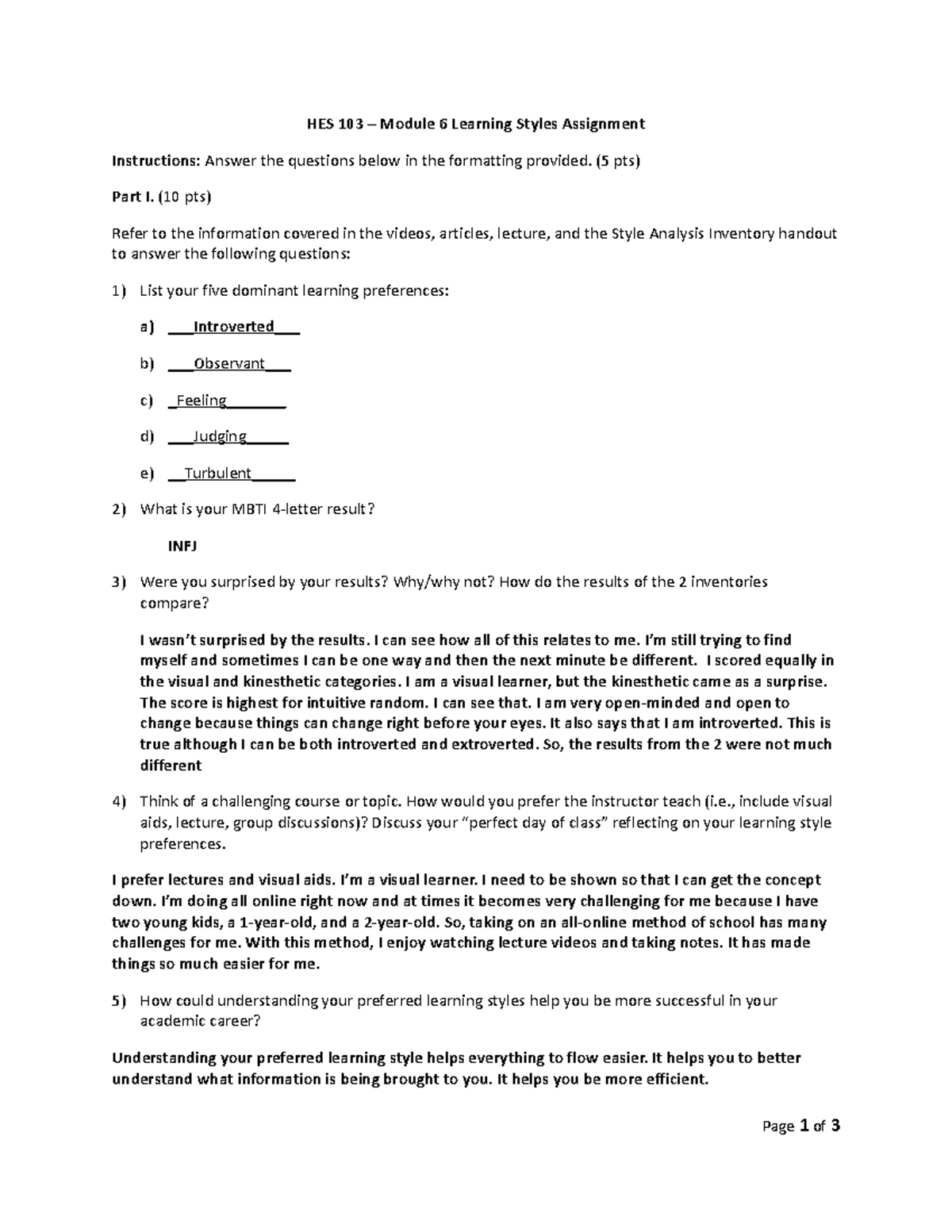 Learning Styles Assignment - HES 103 – Module 6 Learning Styles ...