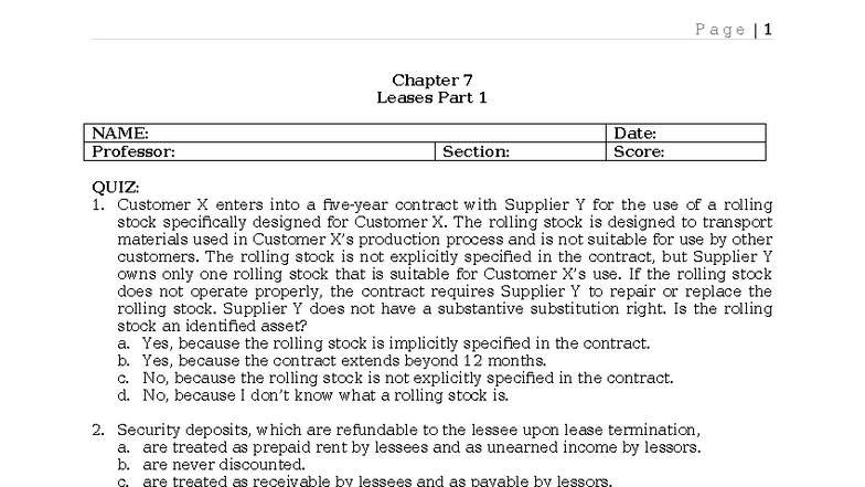 Leases (Course Code: LEA101) - Chapter 7 Quiz Practice Materials - Studocu