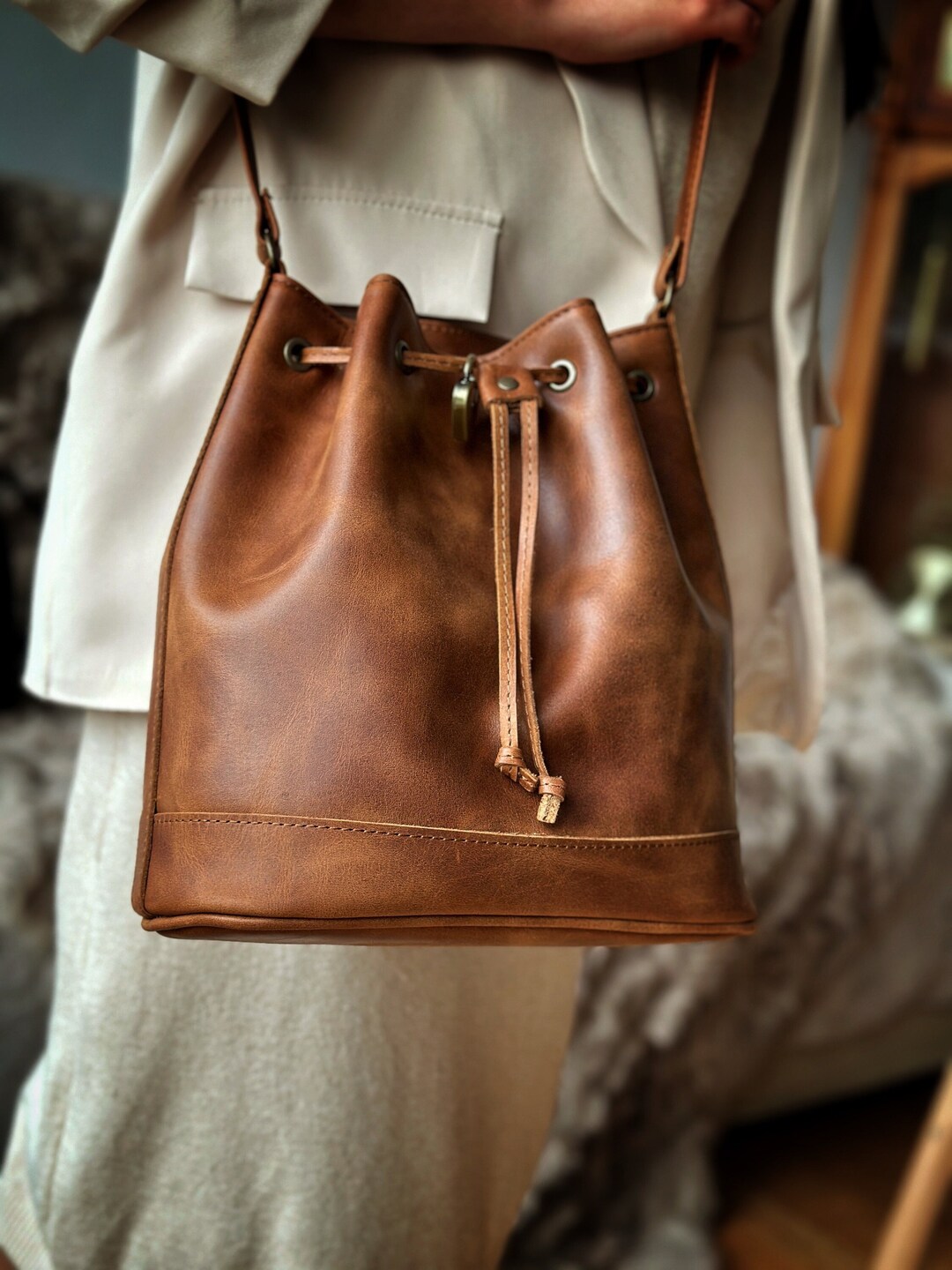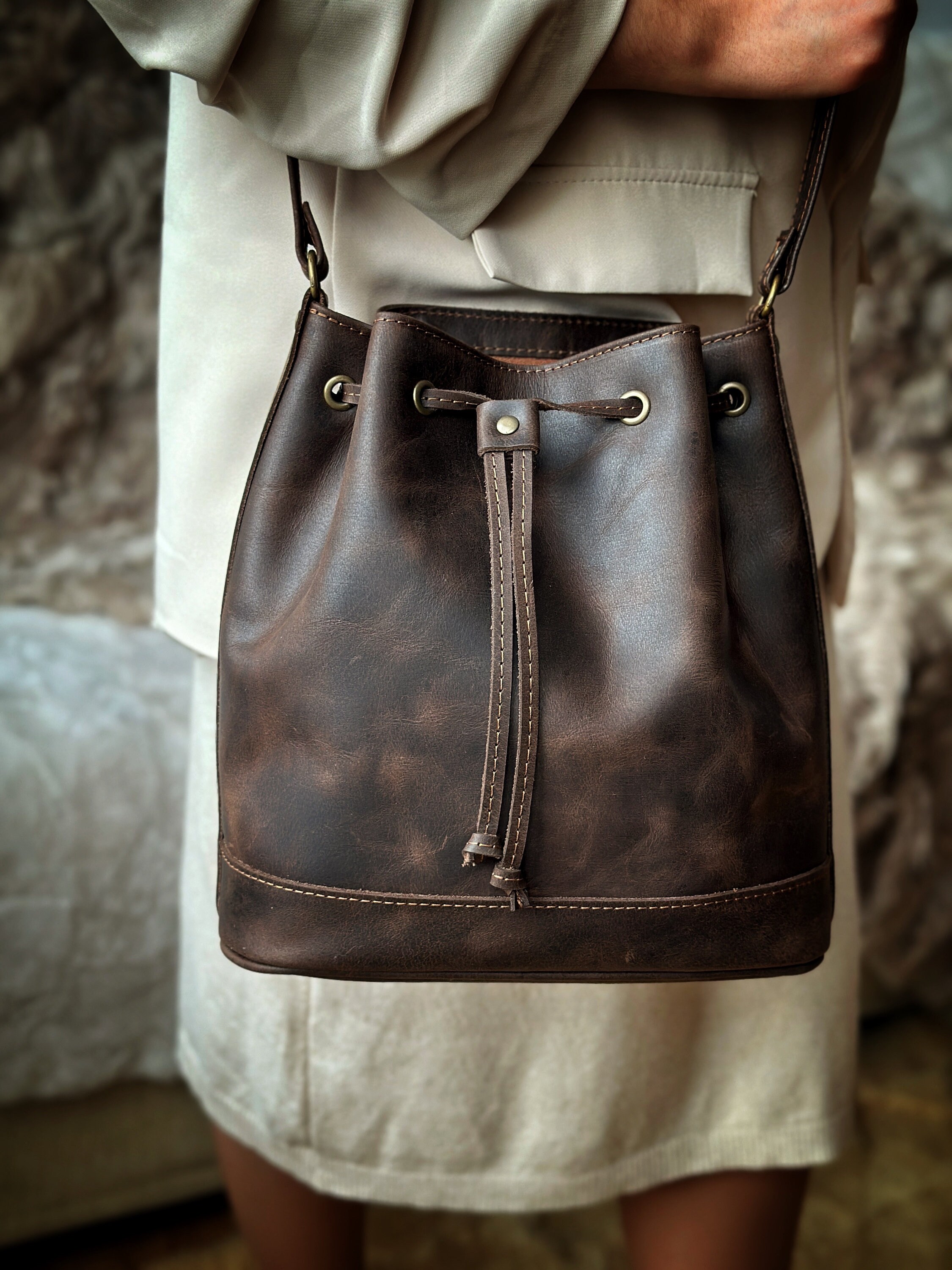Leather Bucket Bag: Handmade Full Grain Cowhide Shoulder Pouch - Etsy