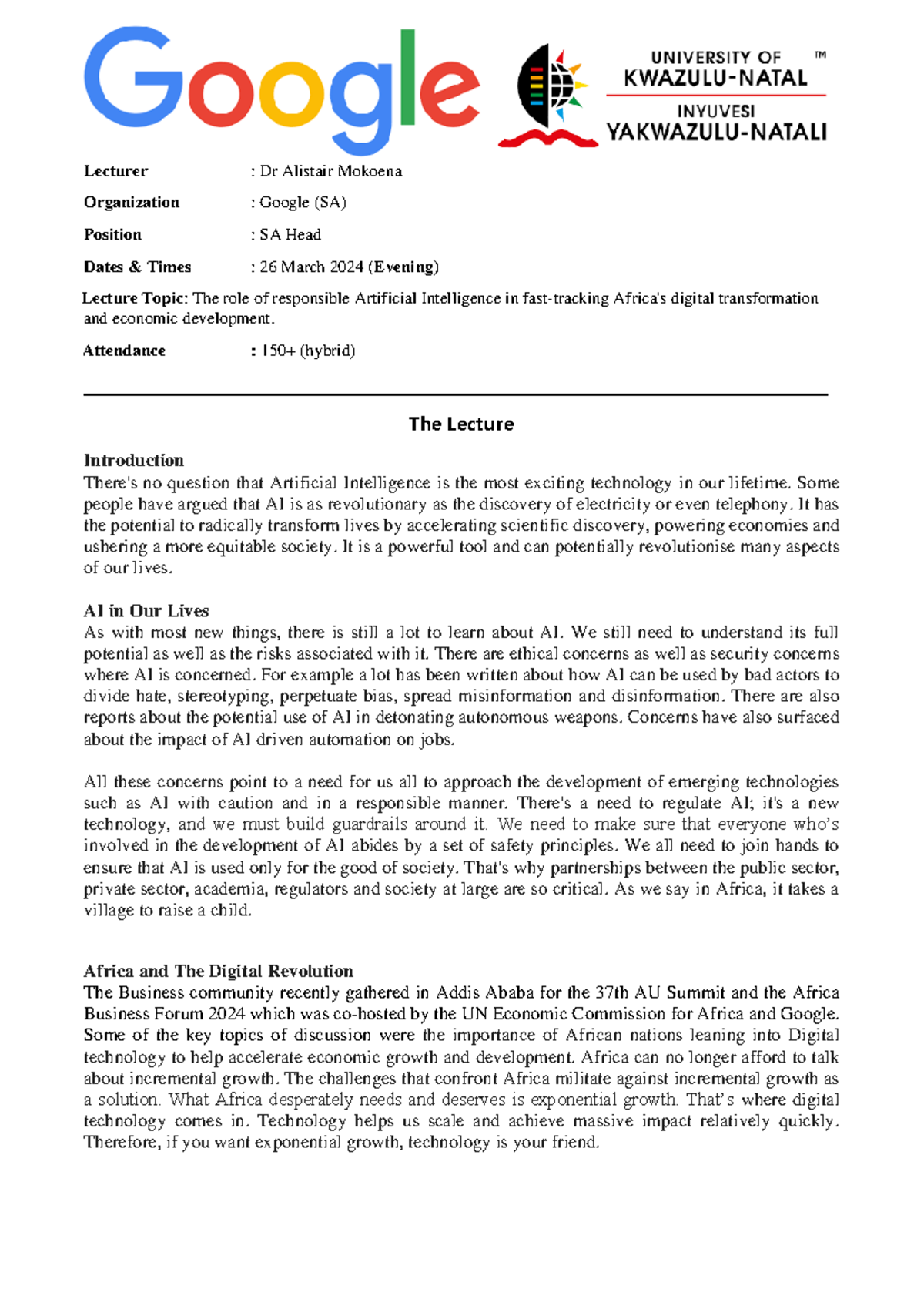 Google Lecture - case study - Lecturer : Dr Alistair Mokoena ...
