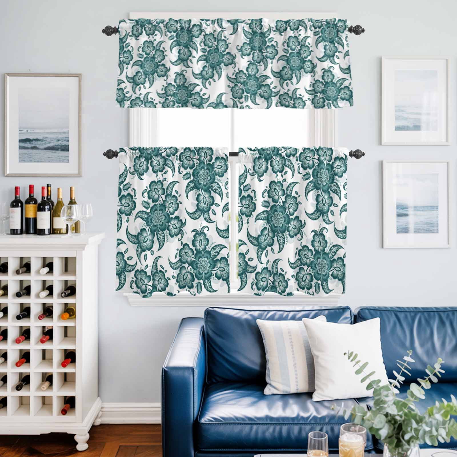 Abstract Cyan-blue Paisley Pattern Curtain Tier and Valance Set 3 Piece ...