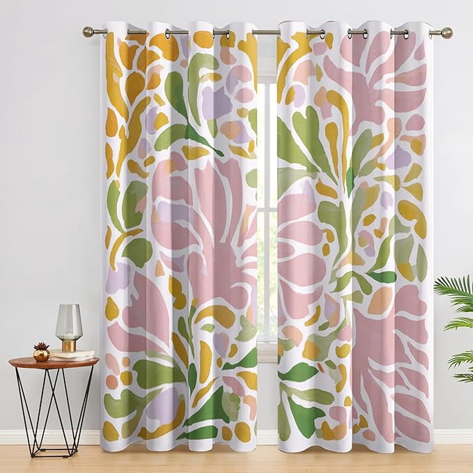 Abstract Floral Curtains for Bedroom Decor, Pink Green Flower Leaf ...