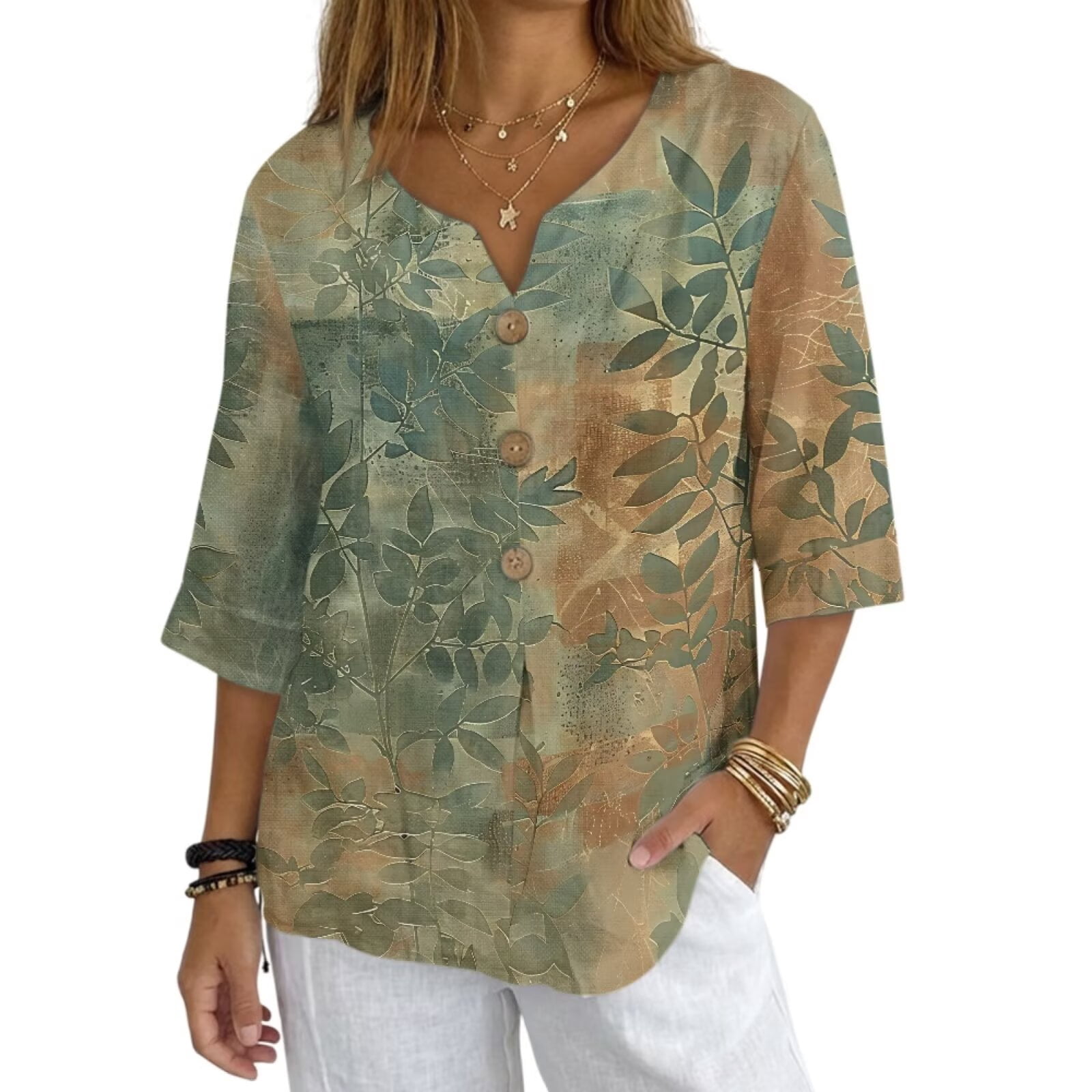 Jiueut Green Leaf Pattern Womens Tops Casual 3/4 Sleeve V Neck Shirt ...