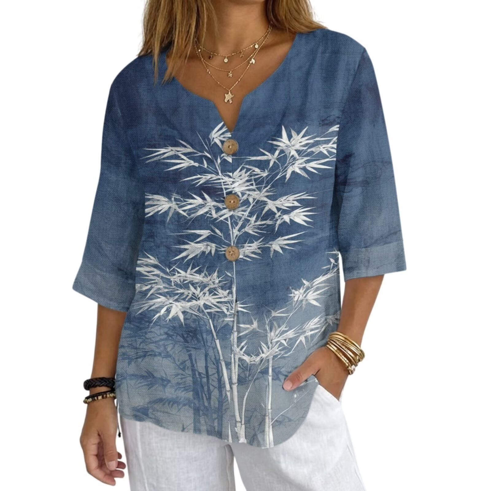 Jiueut Tree Leaf Pattern Womens Shirt 3/4 Sleeve V Neck Soft Tops Linen ...
