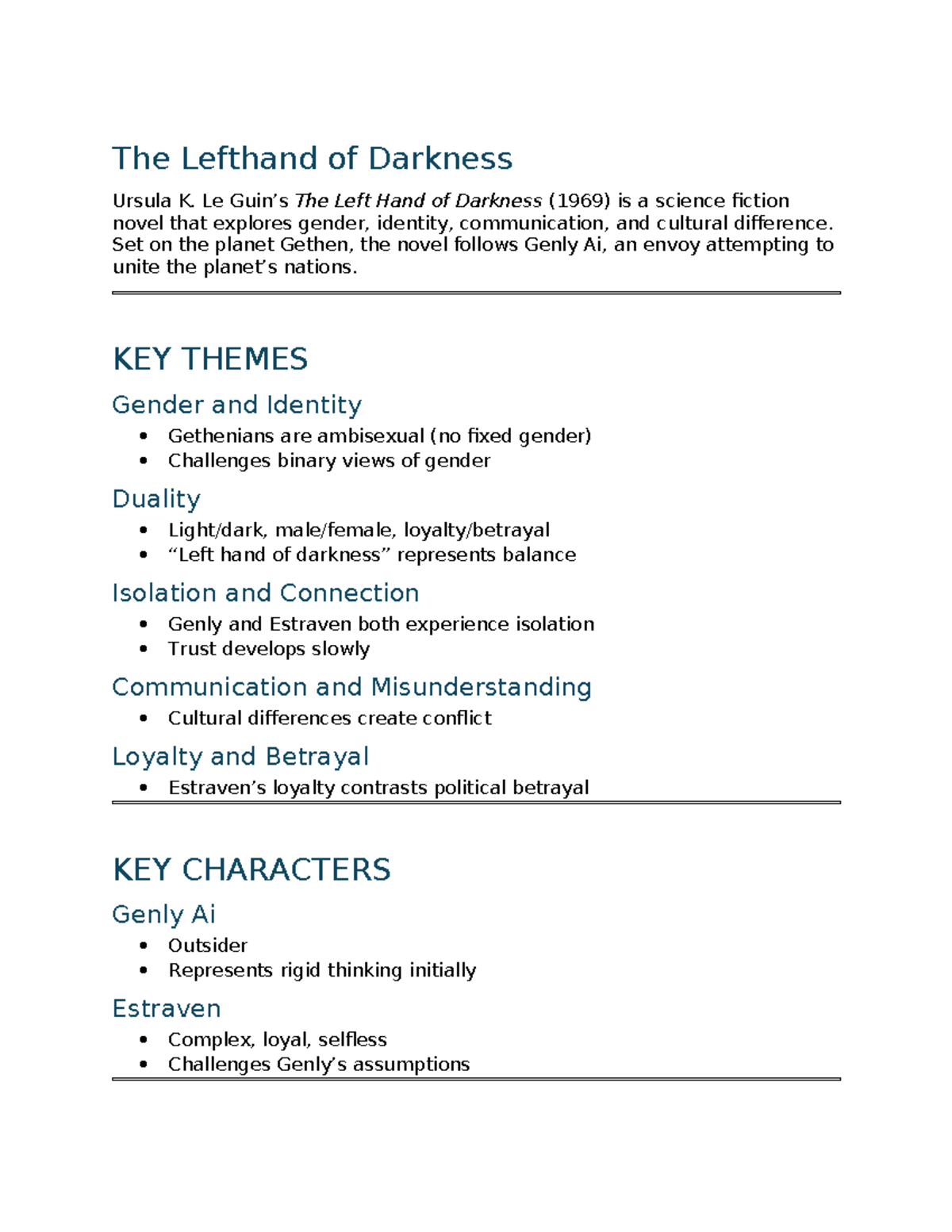The Left Hand of Darkness (ENG 101) Study Guide and Analysis - Studocu