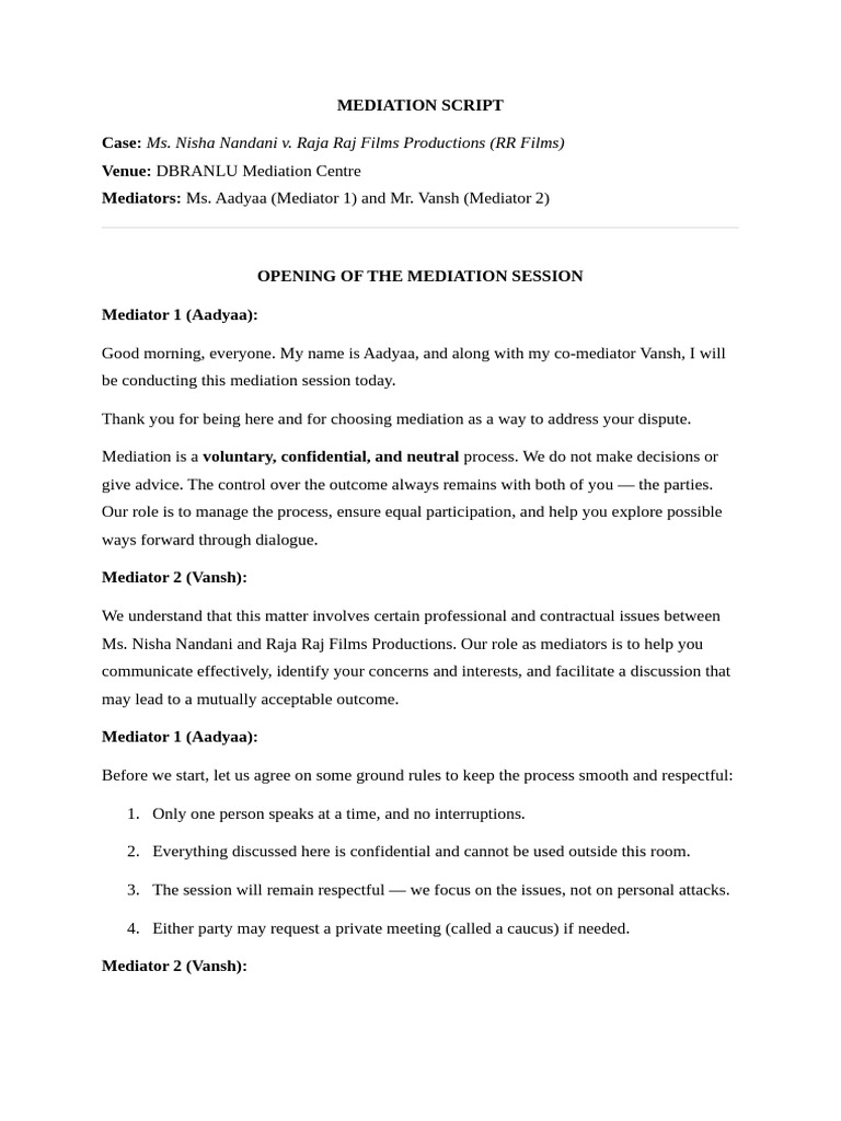 Final Script Mediation - MEDIATION SCRIPT MEDIATORS - NITHISH AND ...