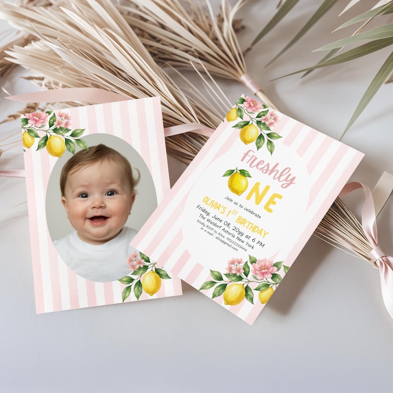 Lemon First Birthday Invitation Girl Freshly One Pink Yellow Theme ...