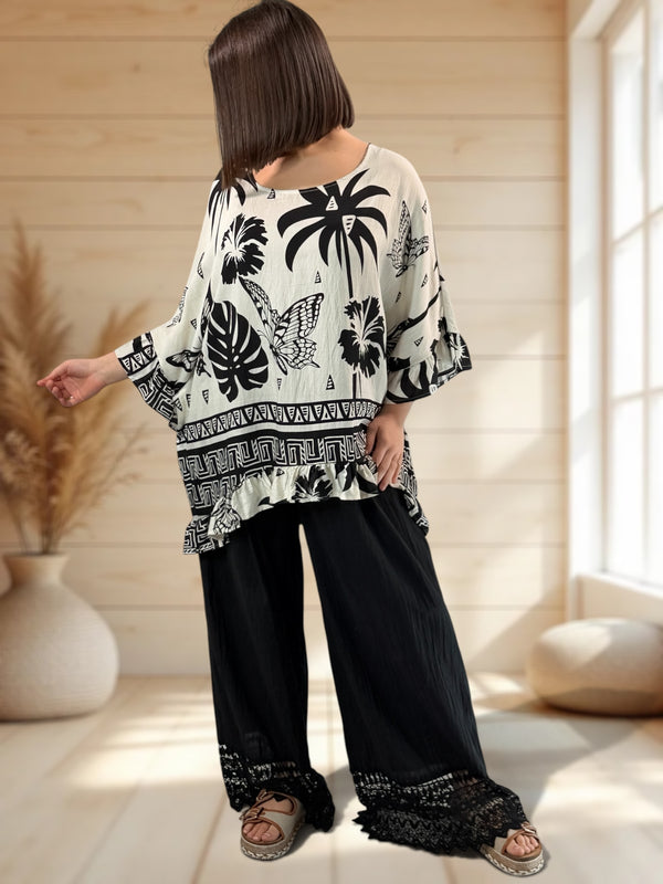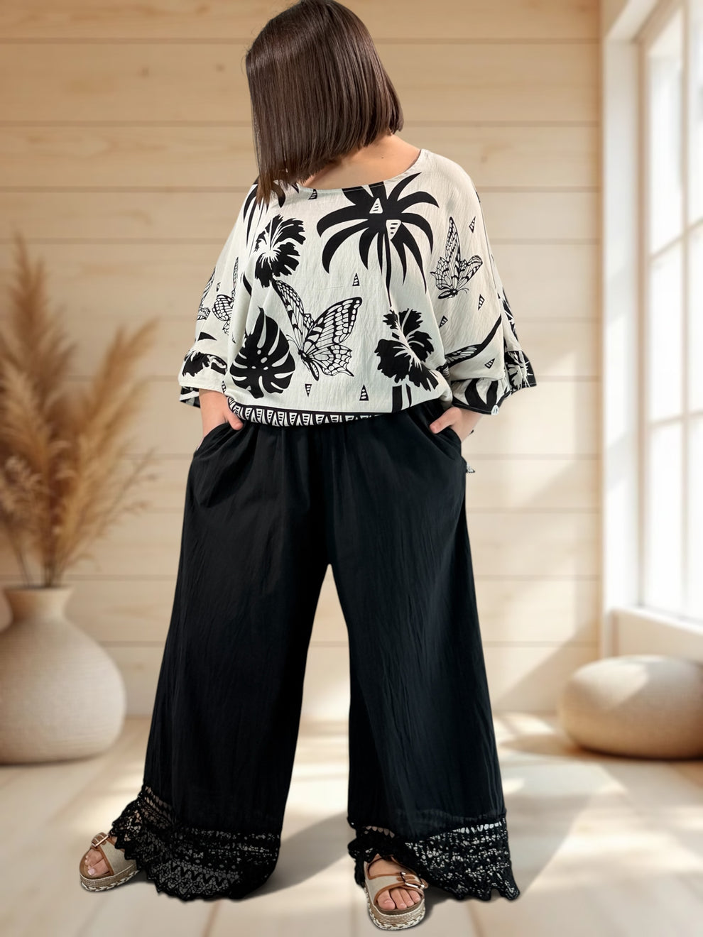 Pantalon en coton noir bordé de dentelle pour grande taille. Site ...