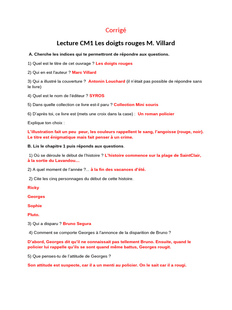 LECTURE Les Doigts Rouges CORRIGE | PDF
