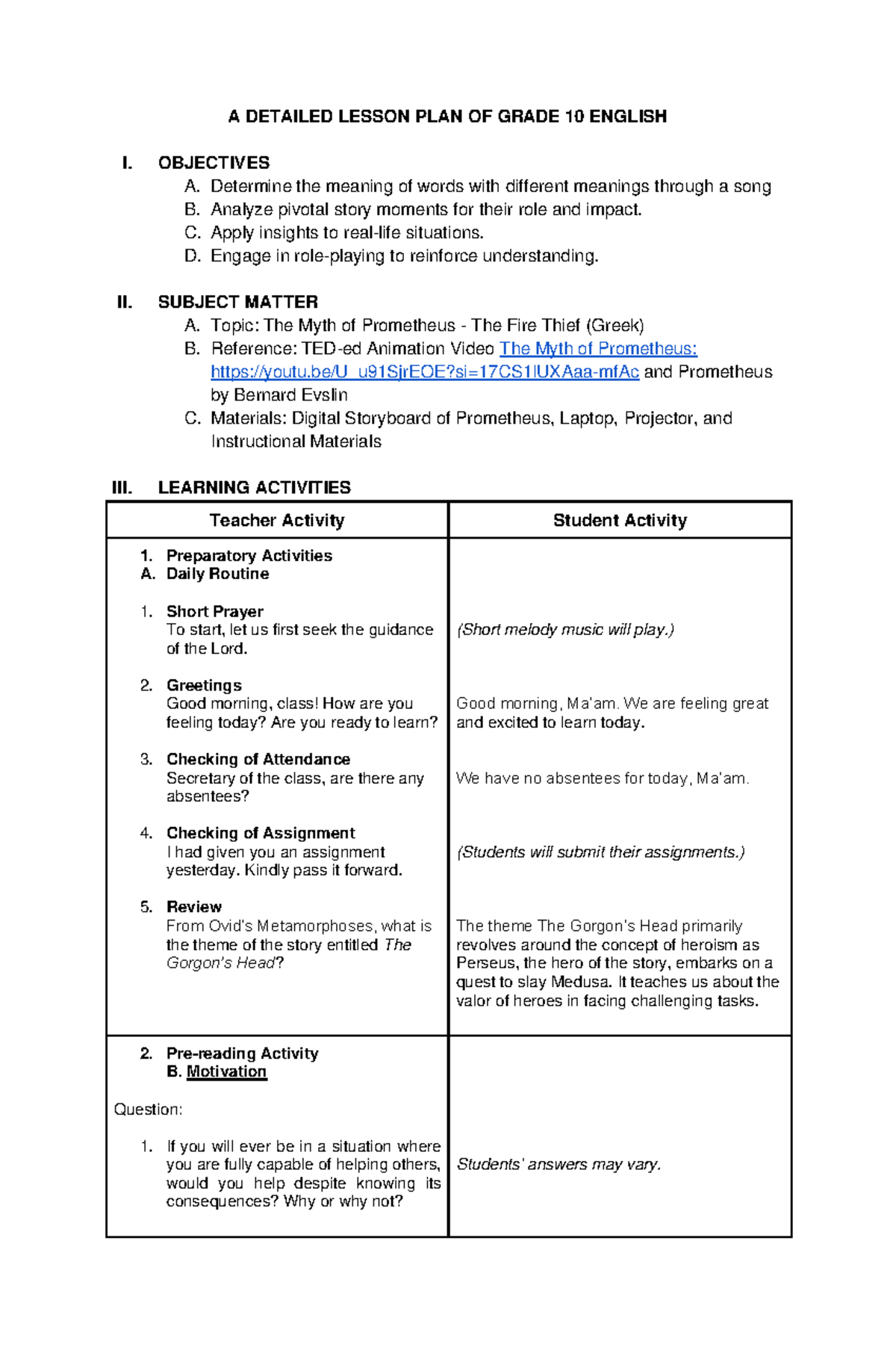 The-Myth-of-Prometheus lp - A DETAILED LESSON PLAN OF GRADE 10 ENGLISH ...