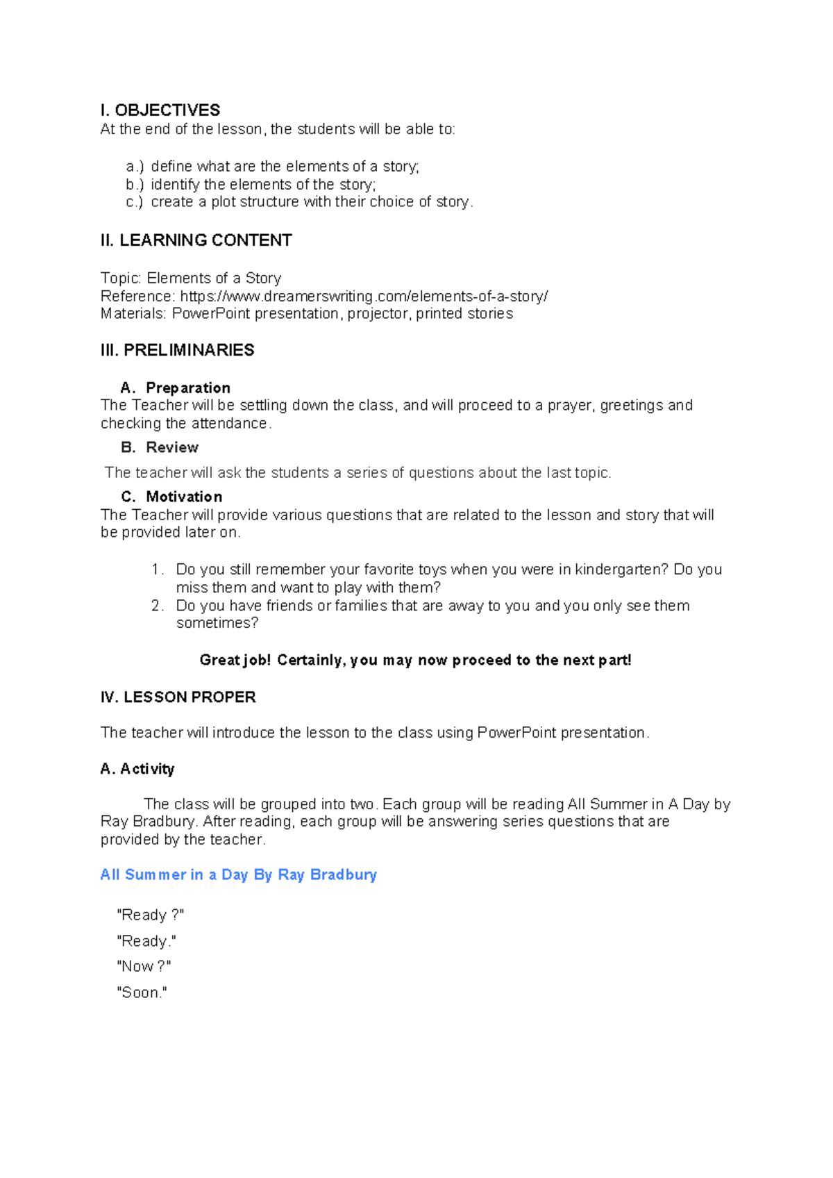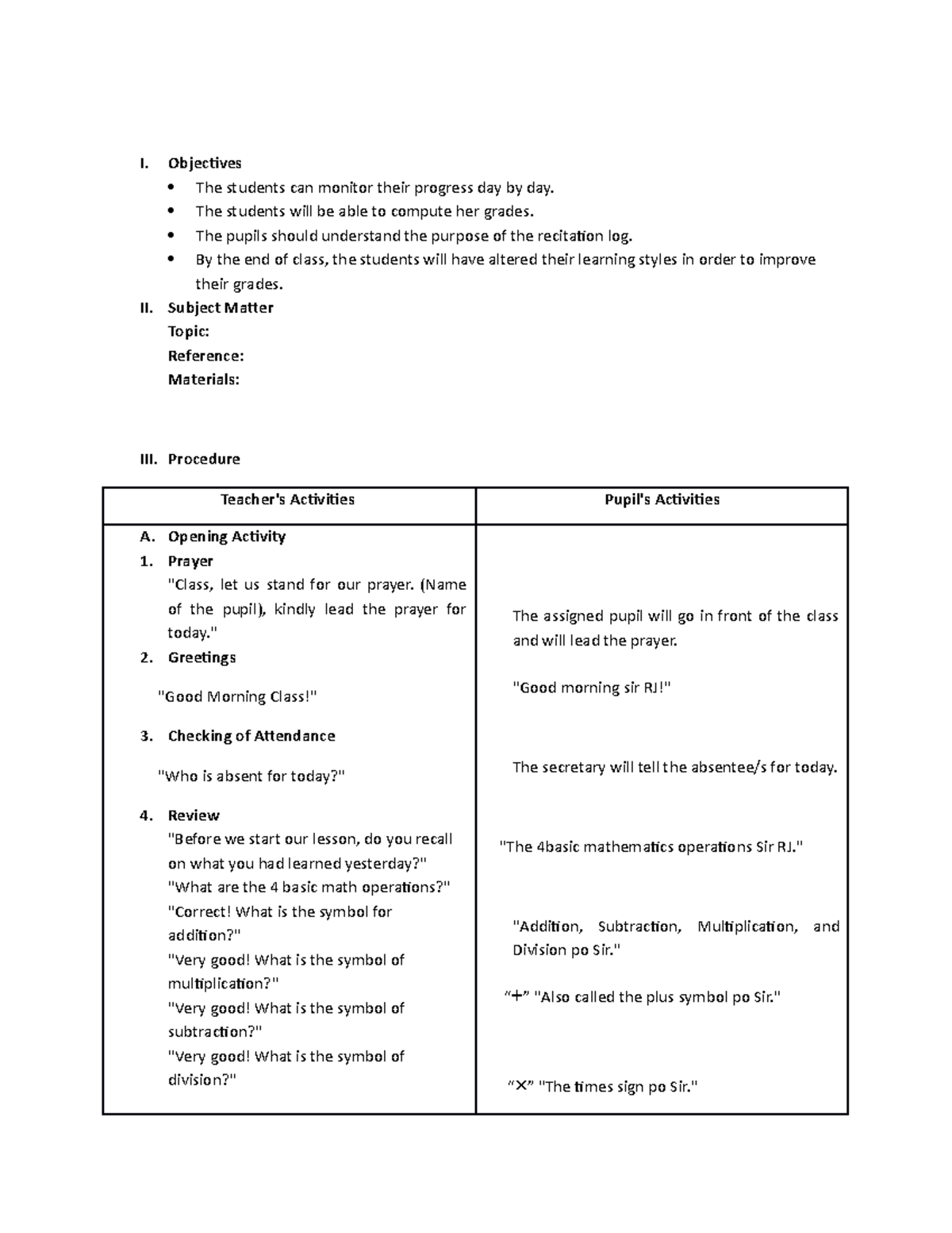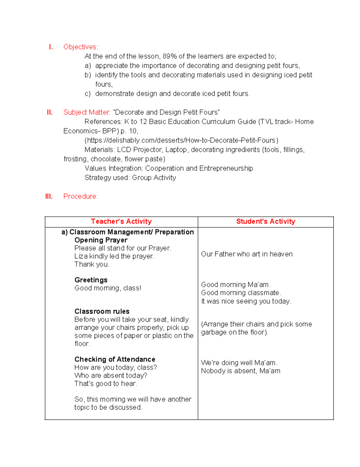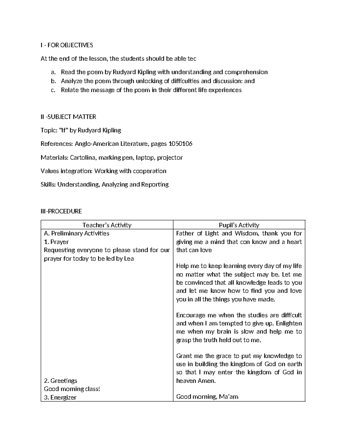 Lp-demo - lesson plan - I. Objectives: At the end of the lesson the ...