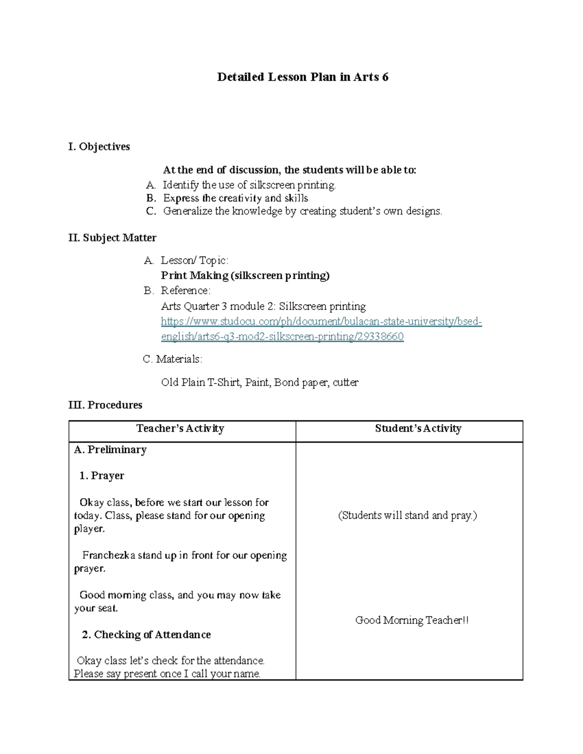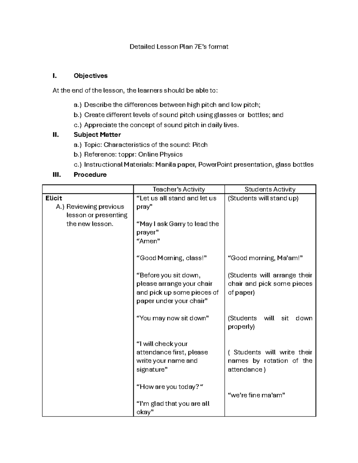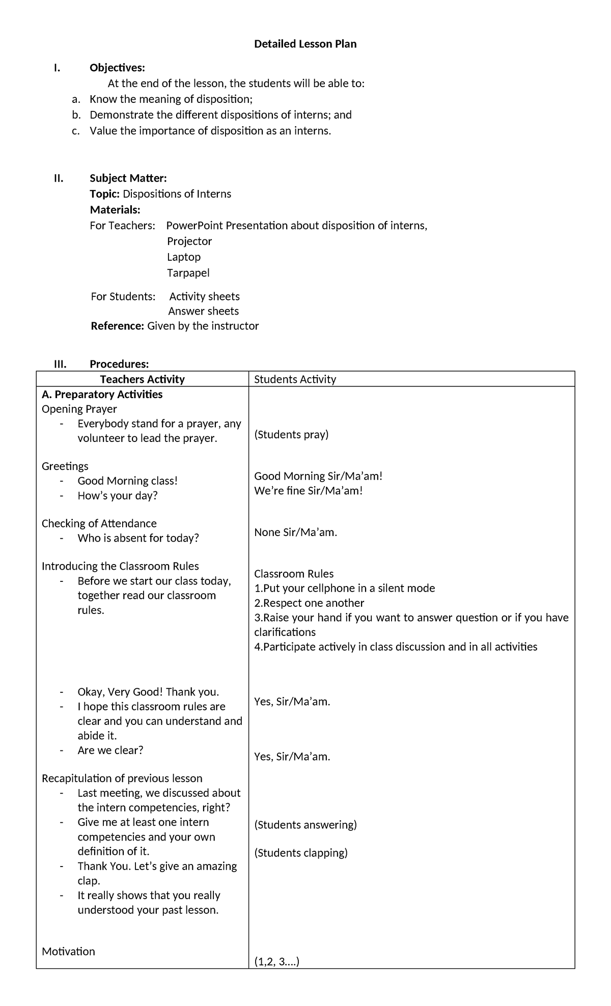 Lessonplan - detailed lesson plan - I. Objective: By the end of the ...