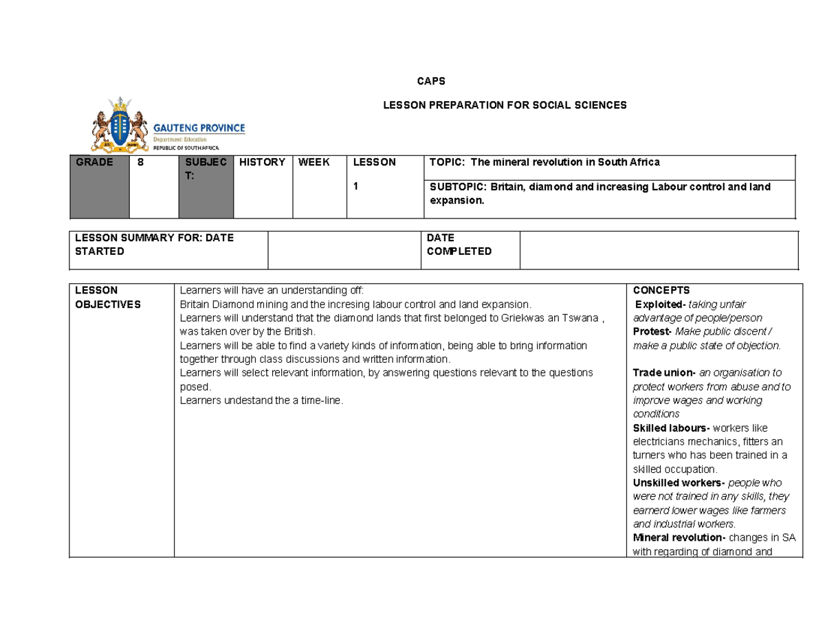 CAPS GRADE 8 HISTORY LESSON SUMMARY: The Mineral Revolution in SA - Studocu