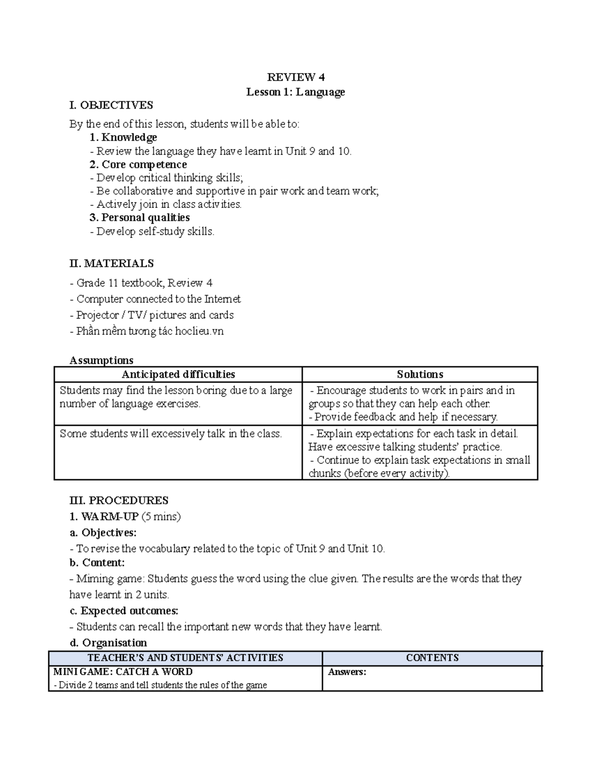 REVIEW 4 - Lesson 1: Language Objectives and Activities - Studocu