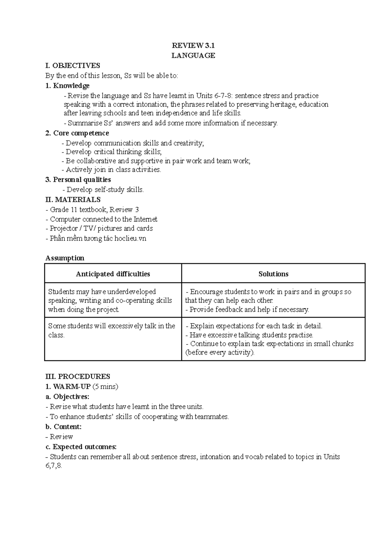 REVIEW 3.1 LANGUAGE I: Objectives and Activities for Grade 11 - Studocu