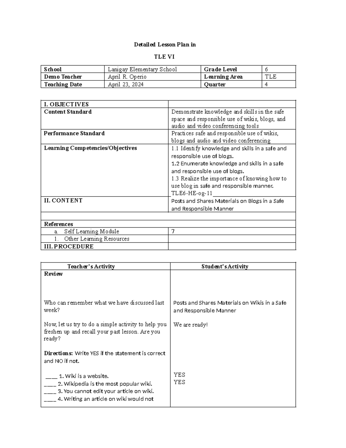 Lesson Plan on Safe Blog Use in TLE VI: Responsible Blogging - Studocu