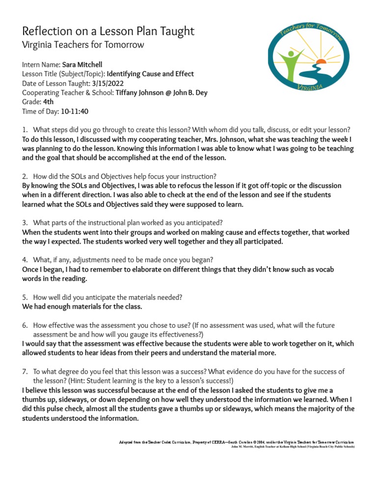 Reflection On A Lesson Plan Taught: Virginia Teachers For Tomorrow ...