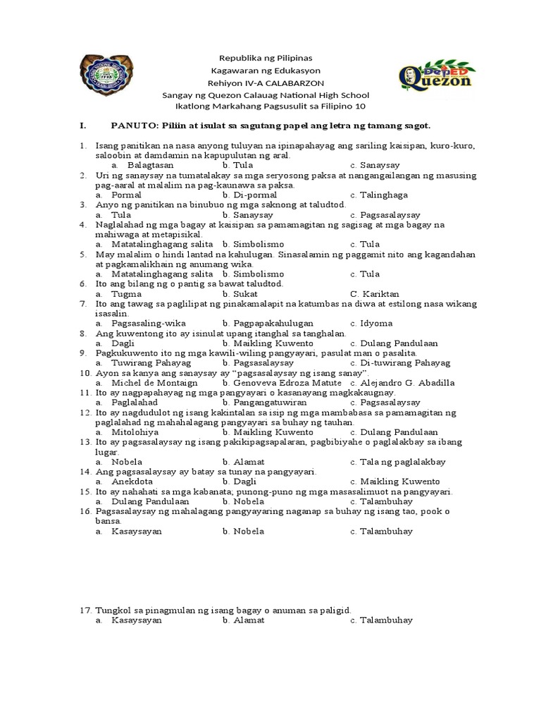 Halimbawa ng Pagsusulit sa Filipino 9 Mga halimbawa ng pagsusulit sa ...