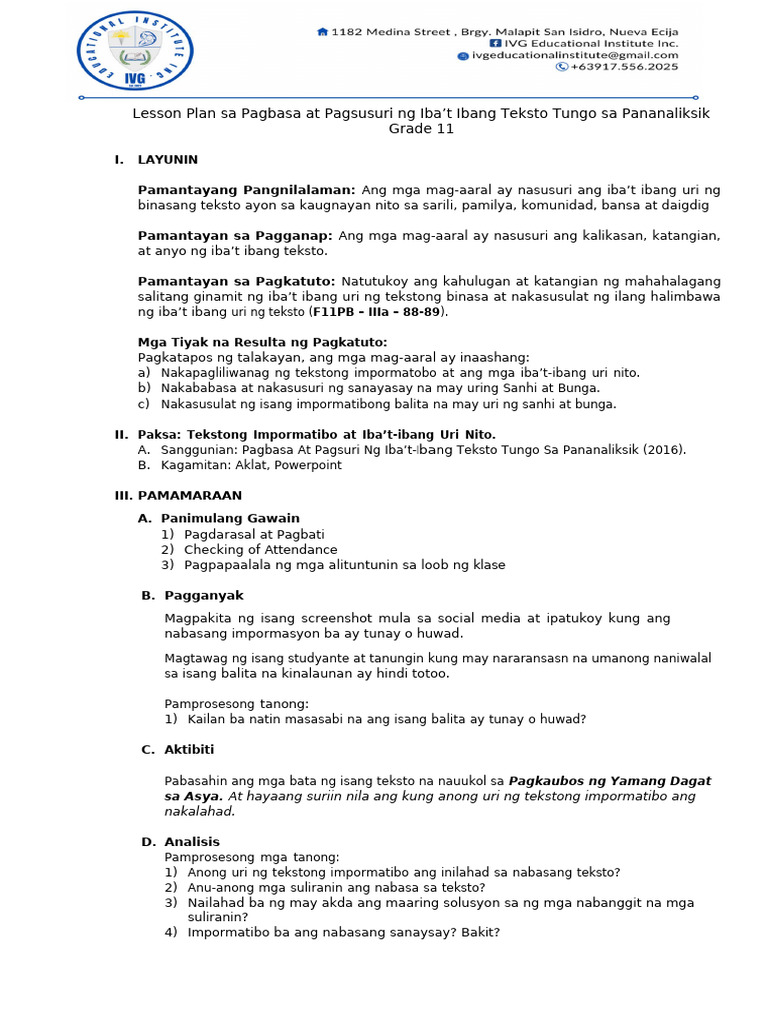 Lesson PLAN Grade 11 - Pagbasa at Pagsusuri (2019 template ...