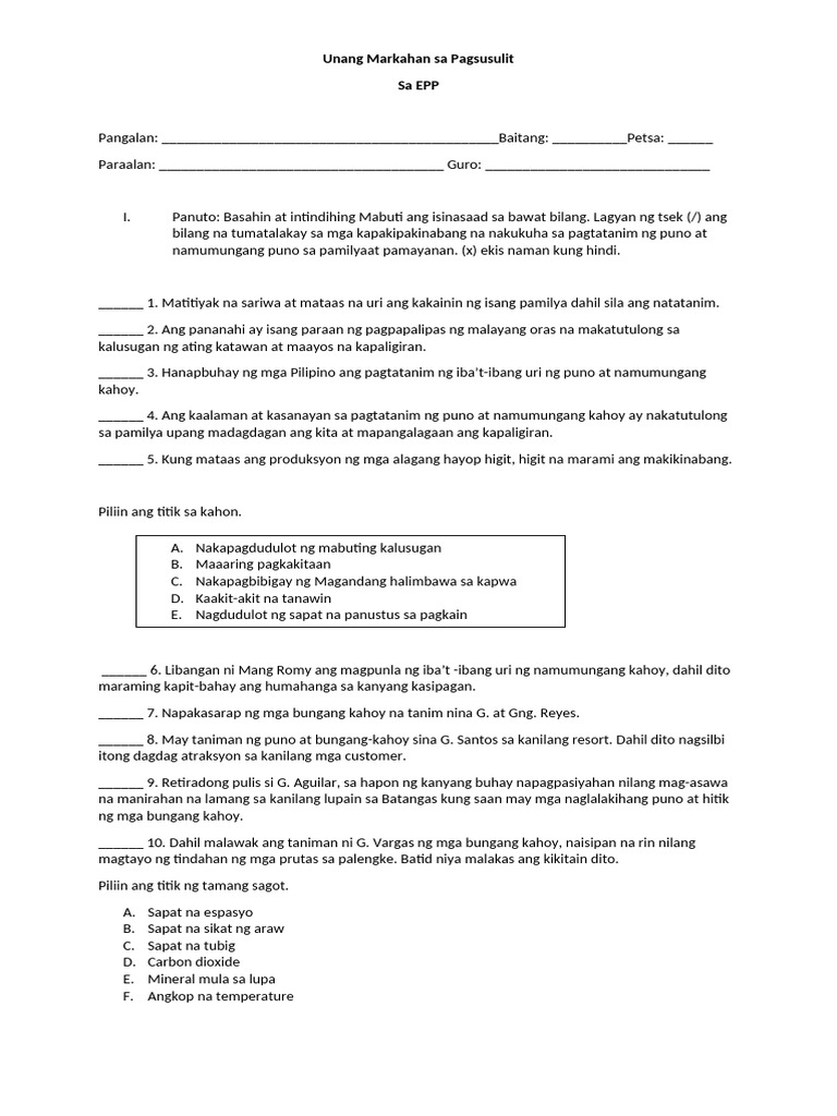 Lingguhang Pagsusulit Sa Epp 1 30 | PDF